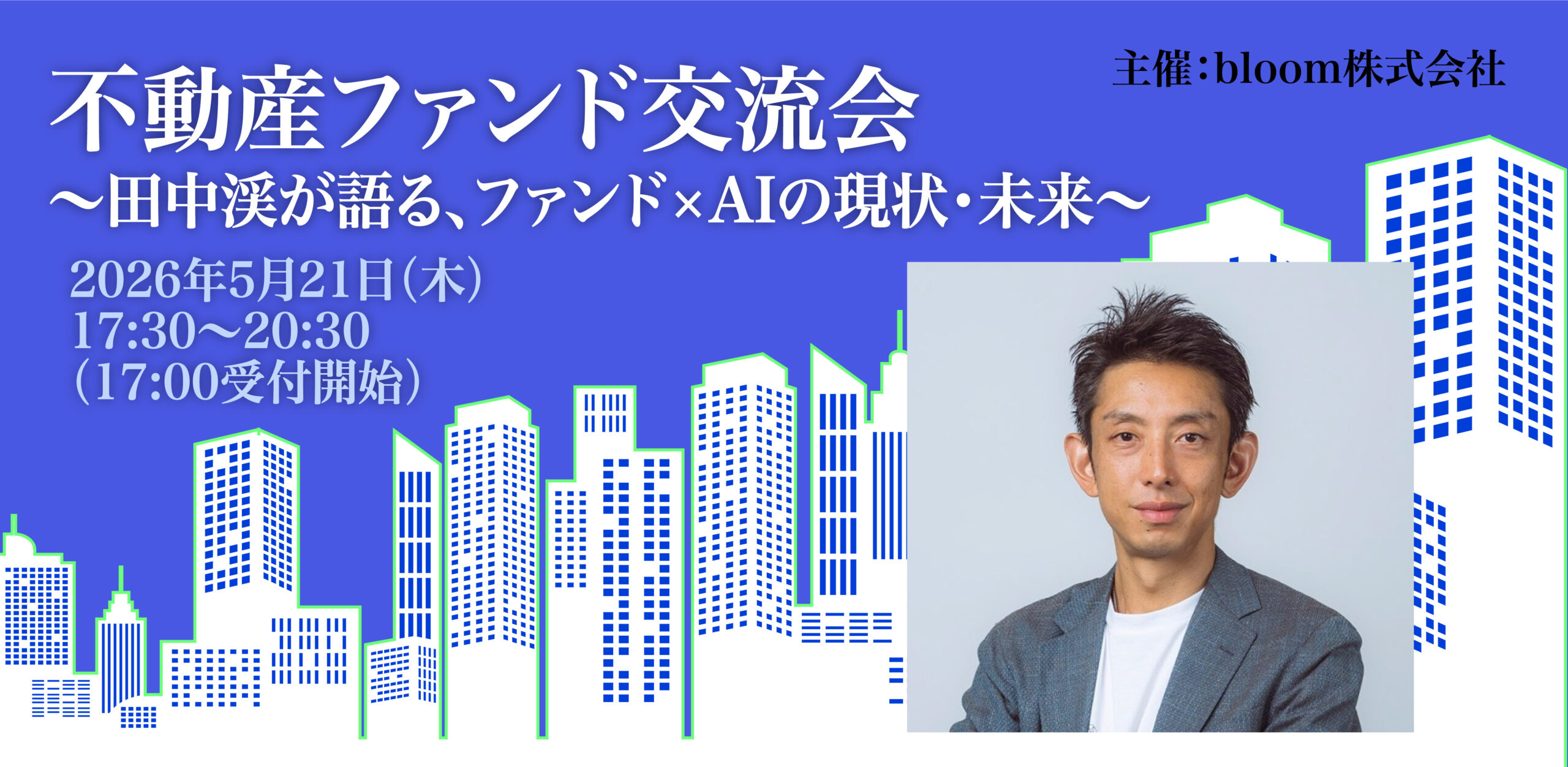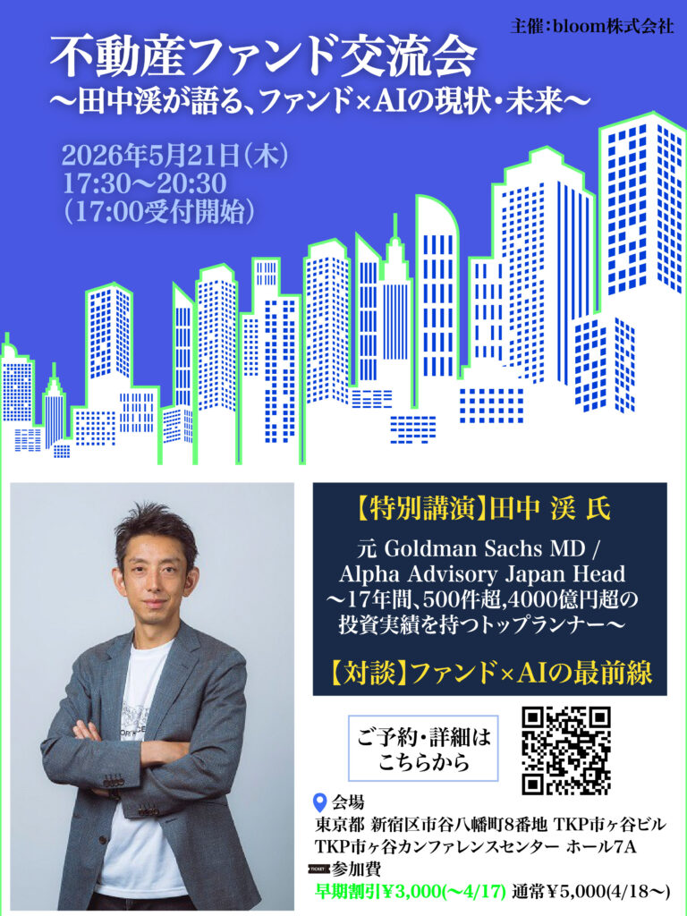 不動産業界特化型の人材紹介サービスを展開するbloom株式会社(以下「bloom」)は、2026年5月21日(木)にTKP市ヶ谷カンファレンスセンターにて、不動産ファンド交流会「田中渓が語る、ファンド×AIの現状・未来」を開催いたします。