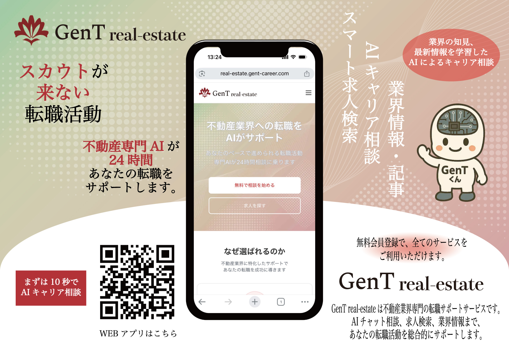 AI技術を活用し、不動産業界に特化した転職活動を全面的にサポートする新しいWEBアプリケーション「GenT real-estate」を2025年9月22日より提供開始したことをお知らせいたします。本サービスは、転職希望者が時間や場所、他人の目を気にすることなく、自身のキャリアについてじっくり考え、最適な一歩を踏み出すための新しい選択肢を提案します。